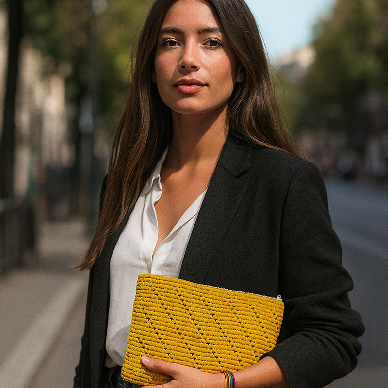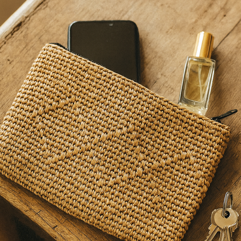 Pensée pour accompagner la femme moderne, la pochette en raphia se porte aussi bien en ville qu’en voyage, apportant cette touche de naturel chic qui traverse les saisons sans jamais se démoder.
